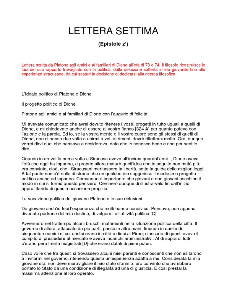 Settima lettera - Plato - Google Books La "Settima lettera" è l'unico testo in nostro possesso in cui Platone parla in prima persona, raccontando della propria formazione giovanile, della delusione verso la politica di Atene, la sua città, e del tentativo - grandioso ma fallimentare - di educare il giovane tiranno di Siracusa Dionisio II, nella speranza di convincerlo a mettere in atto un governo filosofico.