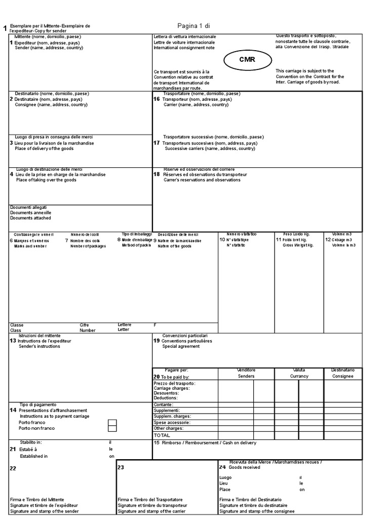 Cmr lettera di vettura pdf. cmr-itc.pdf LETTERA DI VETTURA INTERNAZIONALE. LETTRE DE VOITURE INTERNATIONALE. INTERNATIONAL CONSIGNMENT NOTE. FRACHTBRIEF - TRANSPORTDOKUMENT. 3 Luogo previsto per ... CMR.pdf - Ufficio Facile Esemplare per. Exemplaire pour. Copy for. Exemplar für. LETTERA DI VETTURA INTERNAZIONALE. Il mittente l'expéditeur sender. Absender. CMR. Lettera di vettura internazionale (CMR) - Moduli.it Lettera di vettura o di trasporto internazionale (CMR). CMR è una sigla che sta per Convention des Marchandises par Route, ed è l'accordo internazi... modello cmr - movest spa LETTERA DI VETTURA INTERNAZIONALE ... trasporto internazionale di merci su strada (CMR) ... (CMR). 16 Trasportatore (cognome, name, indirizzo, stato).